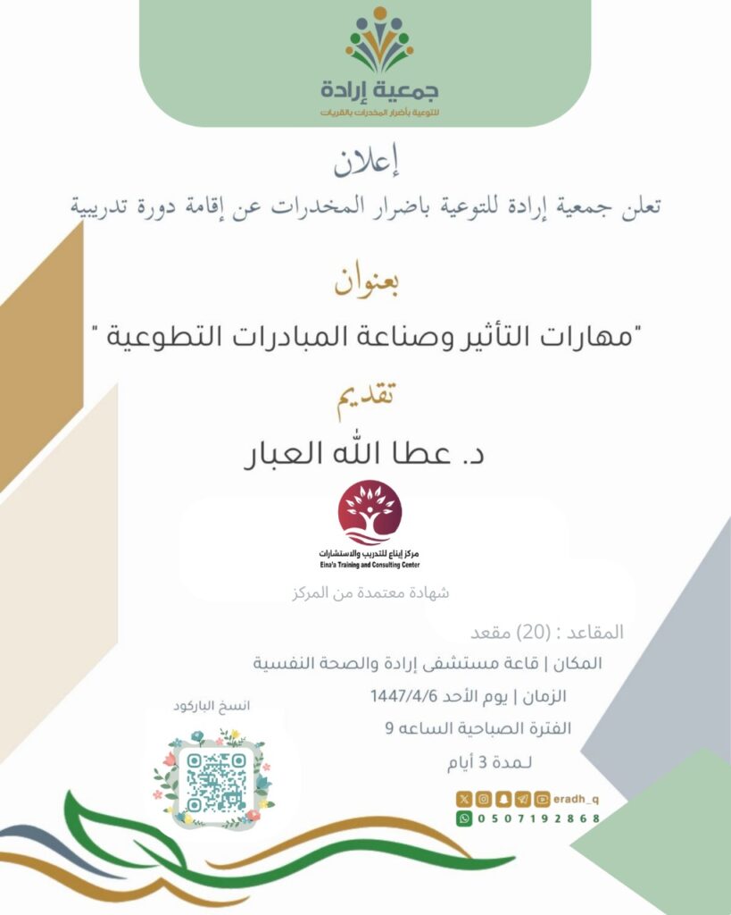 تعلن جمعية إرادة للتوعية بأضرار المخدرات بالقريات عن دورة مهارات التأثير وصناعة المبادرات التطوعية للمتطوعين والت سوف تقام يوم الأحد 28/9/2025 ولمدة ثلاثة أيام والتي يقوم بتنفيذه الدكتور عطالله سليم العبار