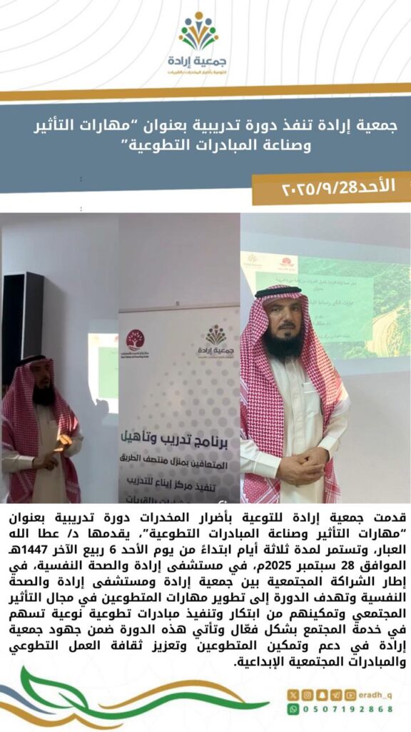 قدمت جمعية إرادة للتوعية بأضرار المخدرات دورة تدريبية بعنوان “مهارات التأثير وصناعة المبادرات التطوعية” قدمها د/ عطا الله العبار وذلك في إطار الشراكة المجتمعية بين جمعية إرادة ومستشفى إرادة والصحة النفسية.