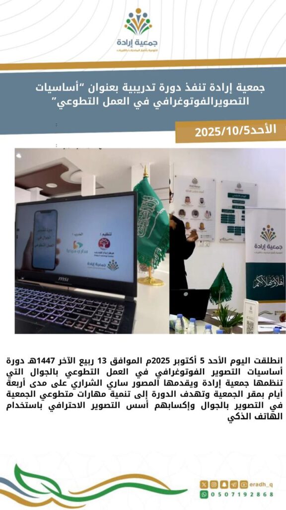 تقدم جمعية إرادة للتوعية بأضرار المخدرات بالقريات دورة أساسيات التصوير الفوتوغرافي في العمل التطوعي بالجوال لمتطوعي الجمعية يقدمها المصور / ساري الشراري على مدى أربعة أيام وتهدف إلى تطوير مهارات التصوير بالجوال لدى المتطوعين