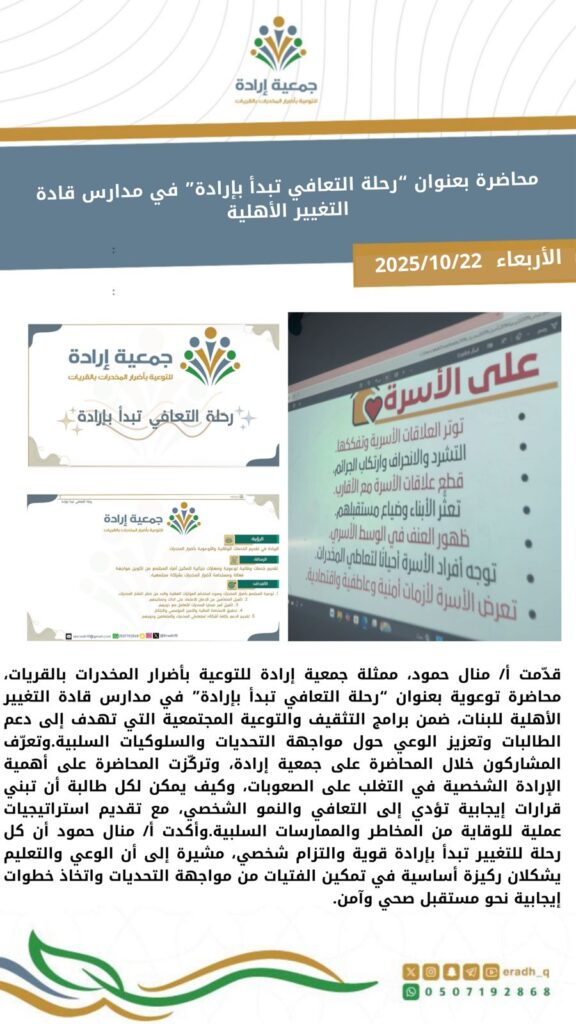 قدّمت جمعية إرادة للتوعية بأضرار المخدرات بالقريات محاضرة توعوية بعنوان “رحلة التعافي تبدأ بإرادة” في مدارس قادة التغيير الأهلية، تركزت على أهمية الإرادة الشخصية في التغلب على الصعوبات واتخاذ قرارات إيجابية للنمو الشخصي والوقاية من السلوكيات السلبية.