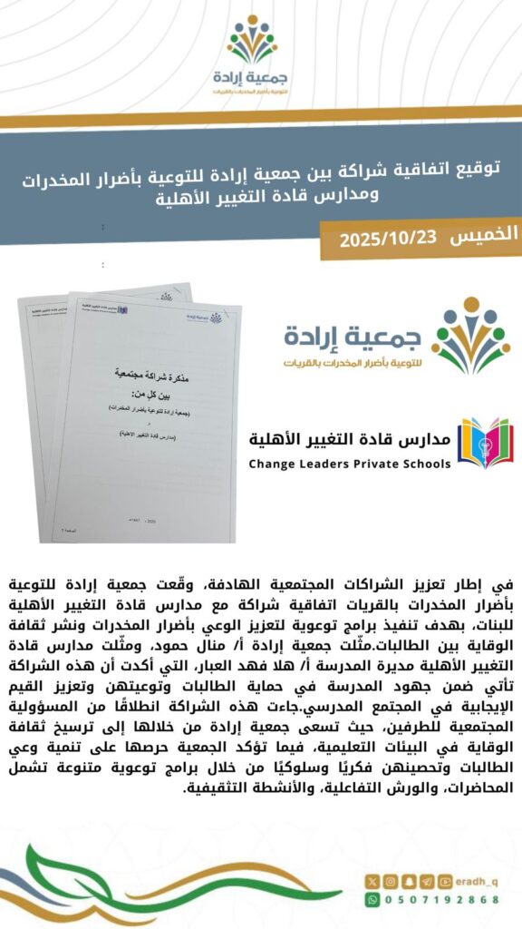 وقّعت جمعية إرادة للتوعية بأضرار المخدرات بالقريات اتفاقية شراكة مع مدارس قادة التغيير الأهلية للبنات لتعزيز الوعي بأضرار المخدرات ونشر ثقافة الوقاية بين الطالبات ضمن برامج توعوية متنوعة.
