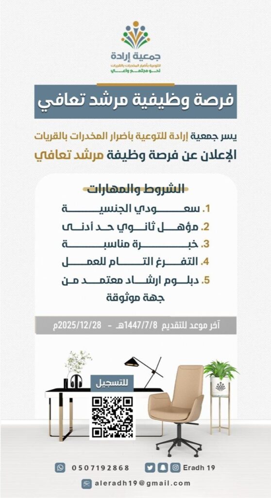 تعلن جمعية إرادة للتوعية بأضرار المخدرات بالقريات عن توفر وظيفة شاغرة بمسمى (مرشد تعافي)