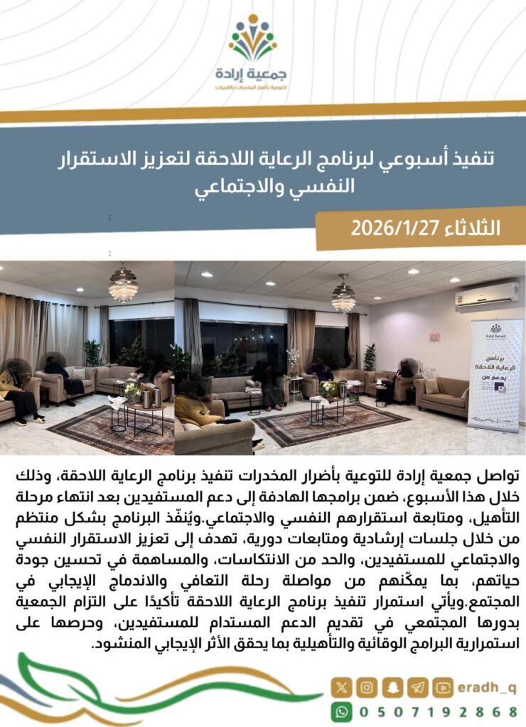 تنفيذ أسبوعي لبرنامج الرعاية اللاحقة لتعزيز الاستقرار النفسي والاجتماعي