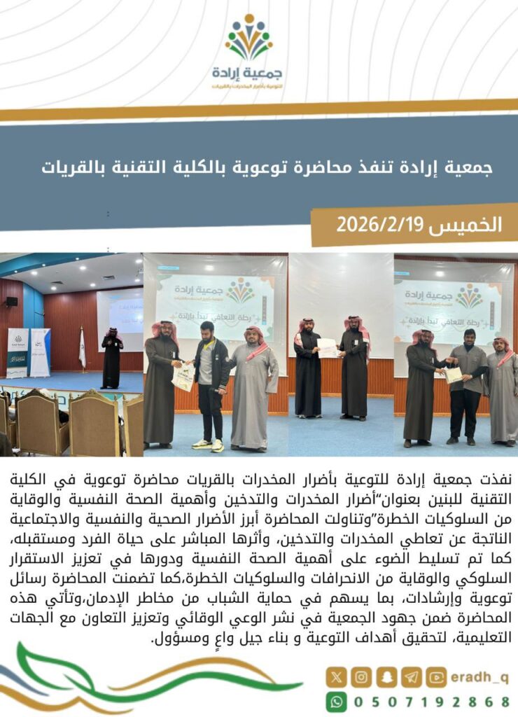 جمعية إرادة للتوعية بأضرار المخدرات بالقريات برقم (1546)