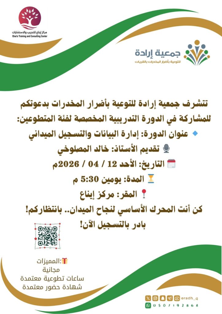 دورة تدريبية بعنوان إدارة البيانات والتسجيل الميداني للمتطوعين .