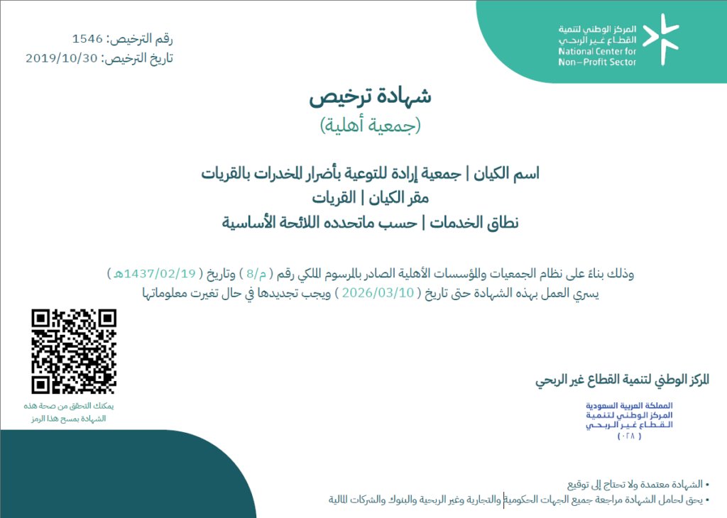 جمعية إرادة للتوعية بأضرار المخدرات بالقريات برقم (1546)